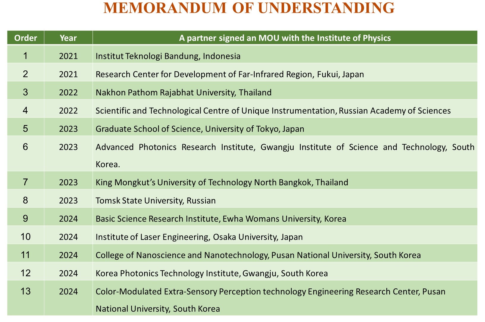 In recent years, through various activities of the International Physics Center, the Institute of Physics has signed multiple memoranda of understanding (MOUs) with leading research institutes and universities worldwide, specifically as follows: