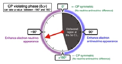 In neutrino physics, CP violation can be measured via the transition from muon neutrinos to electron neutrinos and their antiparticle counterparts. The parameter describing this CP violation in neutrino oscillations, called the Dirac phase (δCP), ranges from –180° to 180°. T2K was the first to exclude nearly half of the possible δCP values with 99.7% (3σ) confidence, beginning to unveil a fundamental property of neutrinos. Future measurements with larger datasets aim to determine whether CP violation in leptons is stronger than in quarks.