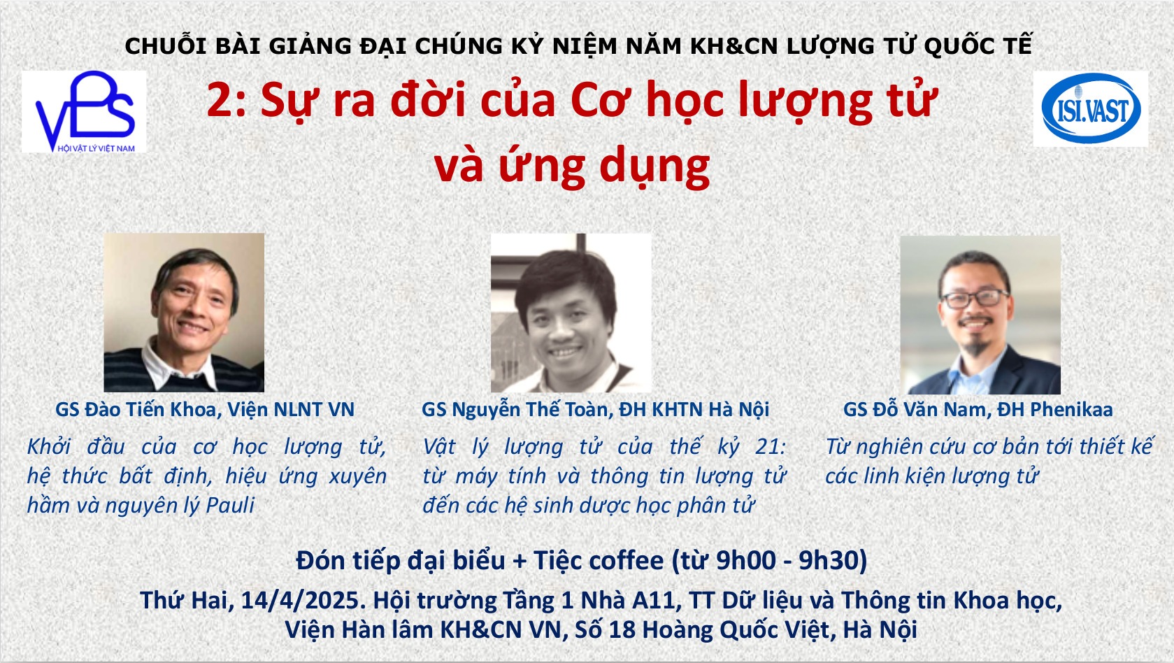 Nhân kỷ niệm Ngày Lượng tử Thế giới (14/4), 100 năm ra đời của thuyết lượng tử và Năm Quốc tế Khoa học và Công nghệ lượng tử - 2025, Hội Vật lý Việt Nam phối hợp cùng Trung tâm Dữ liệu và Thông tin khoa học-Viện Hàn lâm Khoa học và Công nghệ Việt Nam, tổ chức Chuỗi Bài giảng đại chúng về Khoa học và Công nghệ lượng tử.