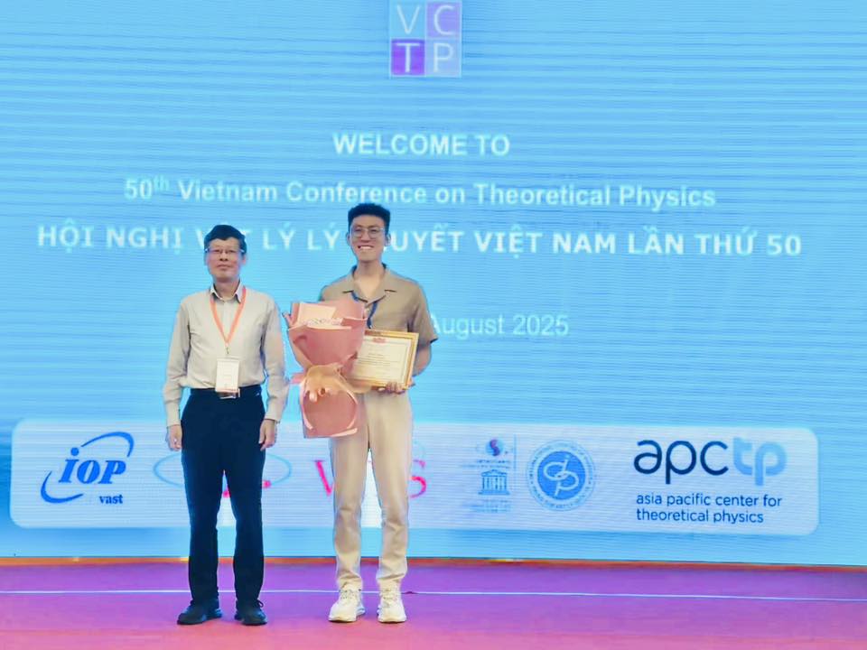 Trên cơ sở đề nghị của Hội đồng xét duyệt Giải thưởng Nghiên cứu trẻ năm 2025, Chủ tịch Hội Vật lý lý thuyết, PGS.TS. Trần Minh Tiến, đã ký quyết định trao tặng 01 Giải thưởng Nghiên cứu trẻ năm 2025 của Hội Vật lý lý thuyết cho ThS. Triệu Đoan An (Đại học Duy Tân).
